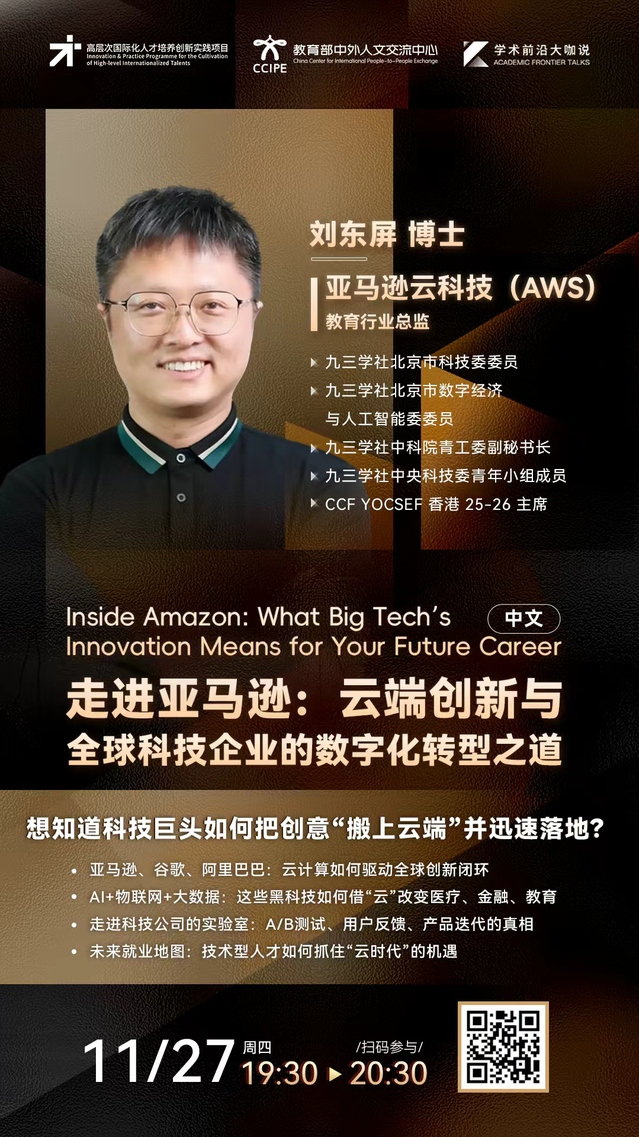 学术前沿大咖说 | 走进亚马逊:云端创新与全球科技企业的数字化转型之道(2025年11月27日 19:30-20:30,主讲人:刘东屏)