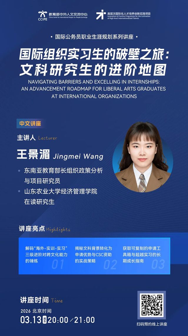 国际公务员职业生涯规划讲座 | 国际组织实习生的破壁之旅:文科研究生的进阶地图(2026年3月13日20:00-21:00,主讲人:王景湄)