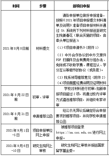 国家留学基金委于2021年9月至10月对新申报项目进行材料审核和专家评审,于2021年10月确定拟立项资助项目。