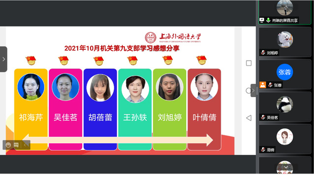 2021年10月29日,机关第九党支部组织全体党员同志集体学习第二十七次全国高校党的建设工作会议、上海高校党的建设工作会议精神。本次主题党日活动由机关第九党支部工青妇委员肖琳同志领学。