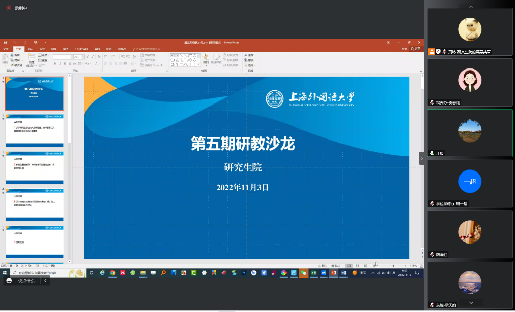 研究生院学位与学籍办公室、培养与国际化办公室工作人员对研究生学位论文初稿检查、校际盲审以及答辩相关工作进行了详细的说明,并向各培养单位介绍了研究生管理系统“导师指导学生情况应用”模块功能及使用方法,并就明年春季学期拟开展的2023级研究生培养方案制(修)订工作进行了交流与讨论。