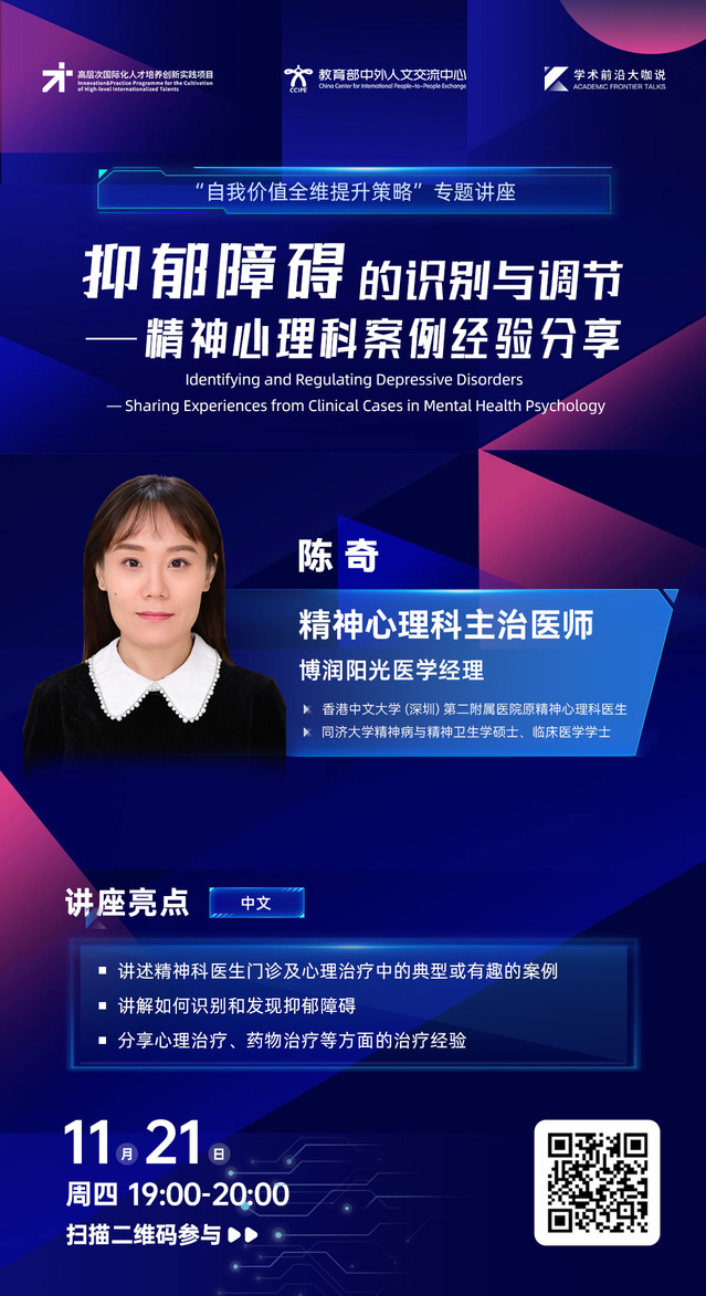 | 抑郁障碍的识别与调节——精神心理科案例经验分享(2024年11月21日 19:00-20:00,主讲人:陈奇) - 上海外国语大学