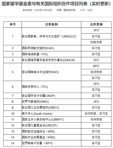 (一)国家留学基金委官网项目专栏:2020年国际组织实习项目专栏