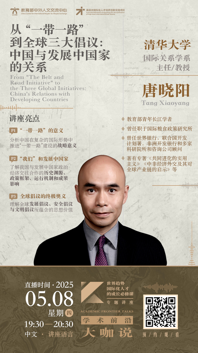 学术前沿大咖说 | 从“一带一路”到全球三大倡议:中国与发展中国家的关系(2025年5月8日 19:30-20:30,主讲人:唐晓阳)